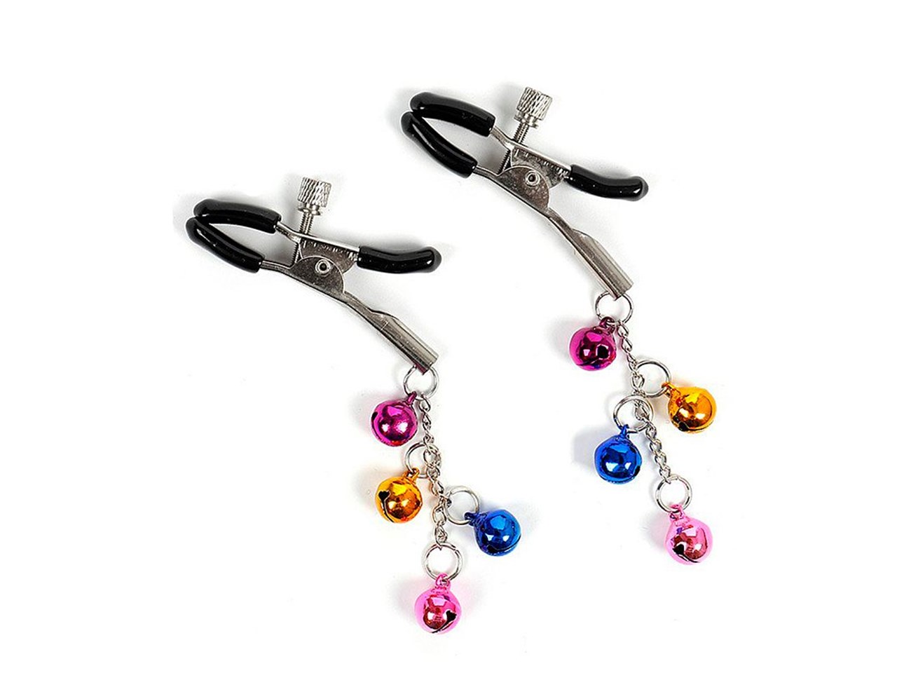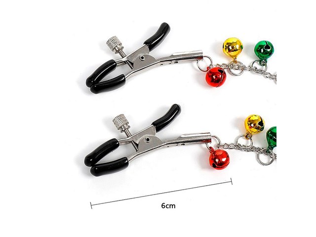 O prendedor de mamilos possui ajustes e guizo de metal.