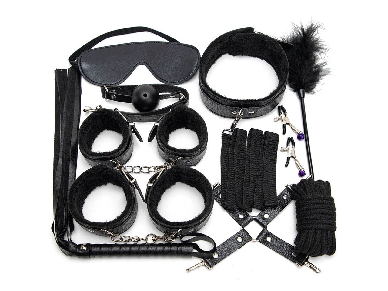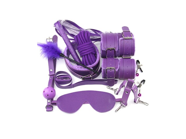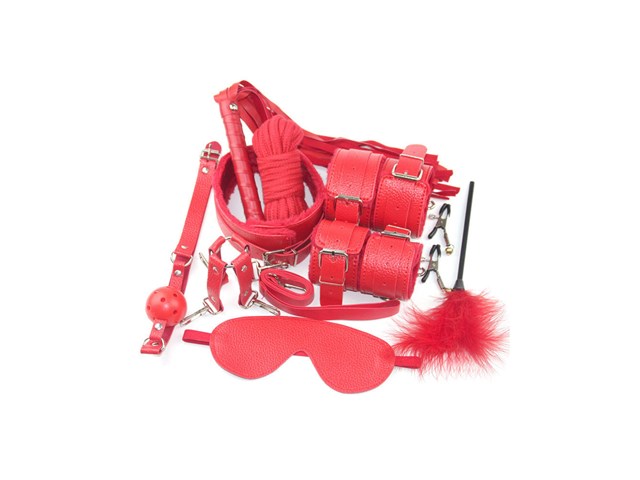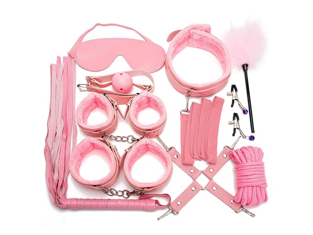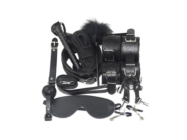 O conjunto inclui: mordaça, venda, coleira com guia, chicote, algemas, tornozeleiras, fecho em formato de cruz, corda de algodão, pluma e prendedor de mamilos.
