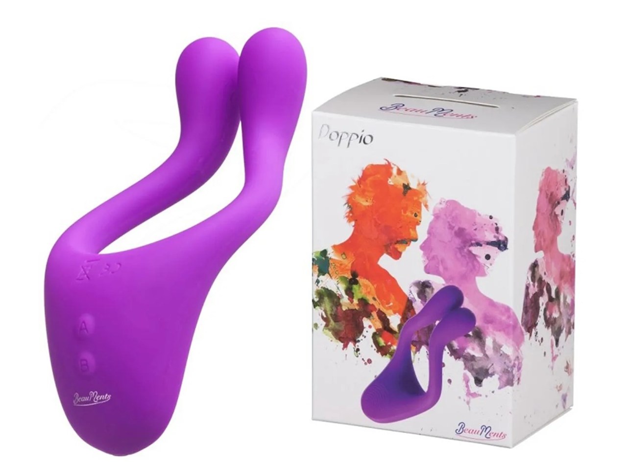 Massageador com design moderno e anatômico, desenvolvido para uso individual ou a dois. Sua textura macia e aveludada, aliada a 3 motores potentes e silenciosos, oferece 7 variações de vibração que tornam a experiência ainda mais envolvente. O Doppio traz inovação para a rotina do casal e pode ser utilizado em mais de 15 posições diferentes, conforme ilustrado nas imagens.