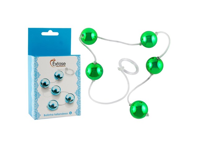 A Bolinha Tailandesa é composta por um cordão de silicone, com cinco bolas plásticas rígidas, com um diâmetro médio de 15mm (pequena). Uma argola na extremidade que facilita o seu uso.